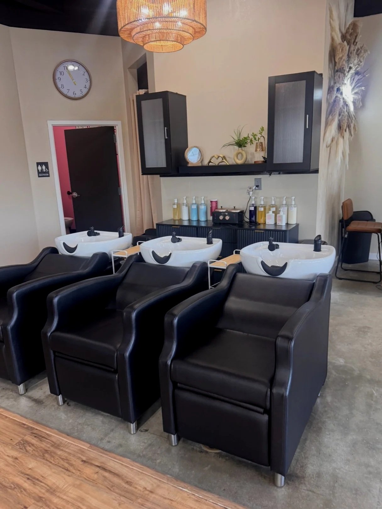 > Backbar supplies including shampoo, conditioner, waxing products, towels, capes, and more